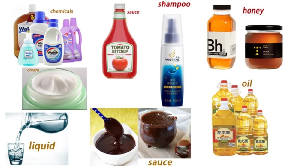 مایعات نیمه چسبناک و چسبناک؛ گربه ، خردل ، شربت ، سالسا ، مایونز ، عسل ، کره بادام زمینی ، ژله ، سس غوطه ور ، مومیایی کردن لب ، شامپو ، صابون های ضخیم ، ژل های یک ظاهر طراحی شده ، ماسک صورت ، موم ، چسب ، گریس ، سیلانت ، سیلیکون و موارد دیگر
